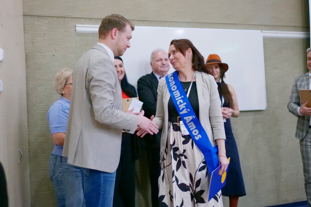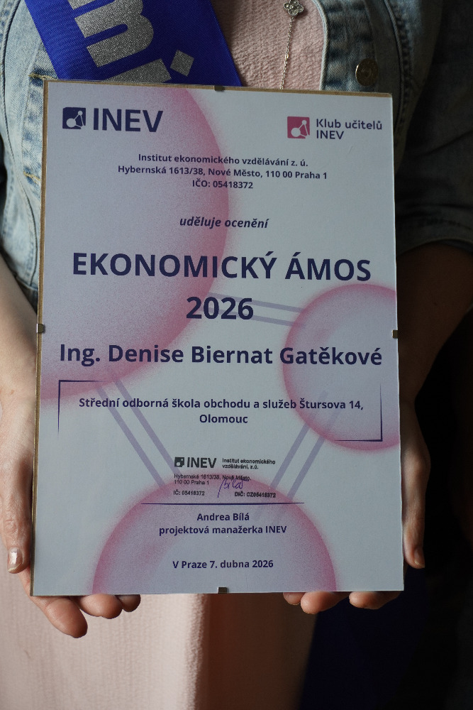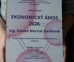 Proto jsme se jako celá třída SD2 spojili a s pomocí dalších ročníků vyplnili krátký dotazník na nominaci Ekonomický Ámos 2026. Toto ocenění je určeno nejlepším středoškolským pedagogům ekonomických předmětů a letos se konal už čtvrtý ročník. O nominaci paní učitelka nevěděla, udělali jsme všechno tajně. :)